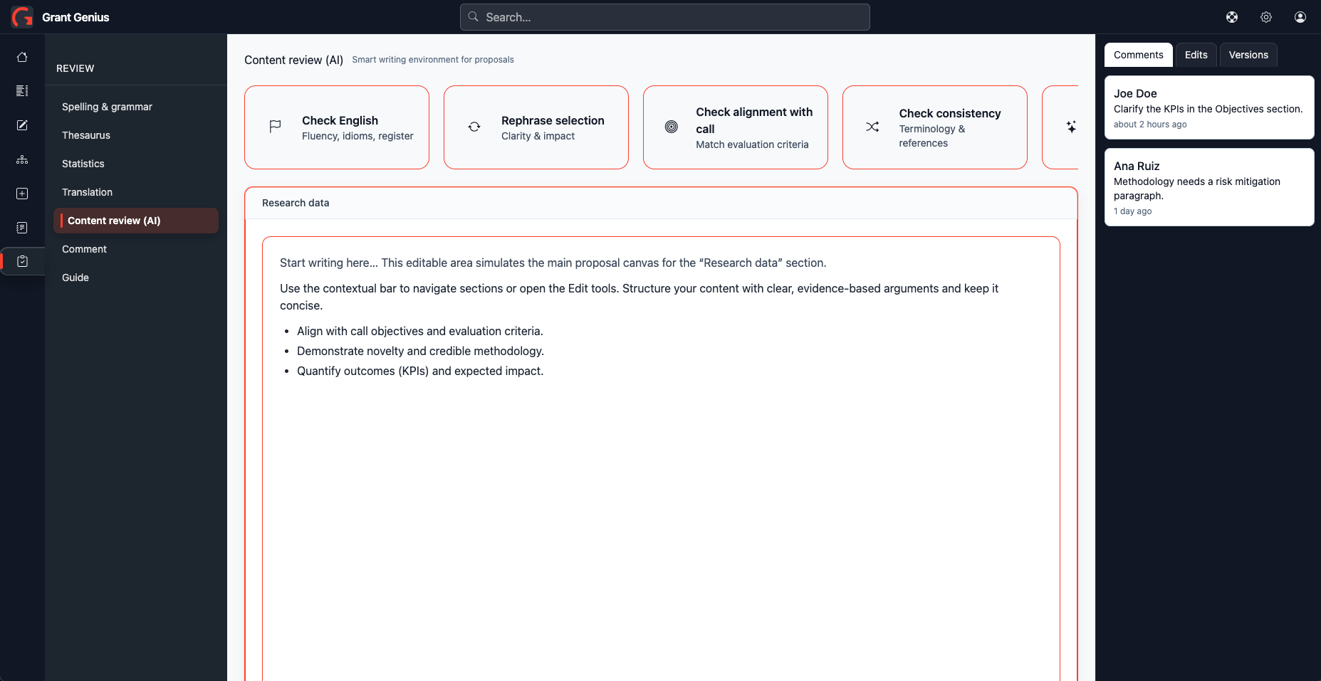 Contextual guides, checklists, and AI support tailored to research proposals.